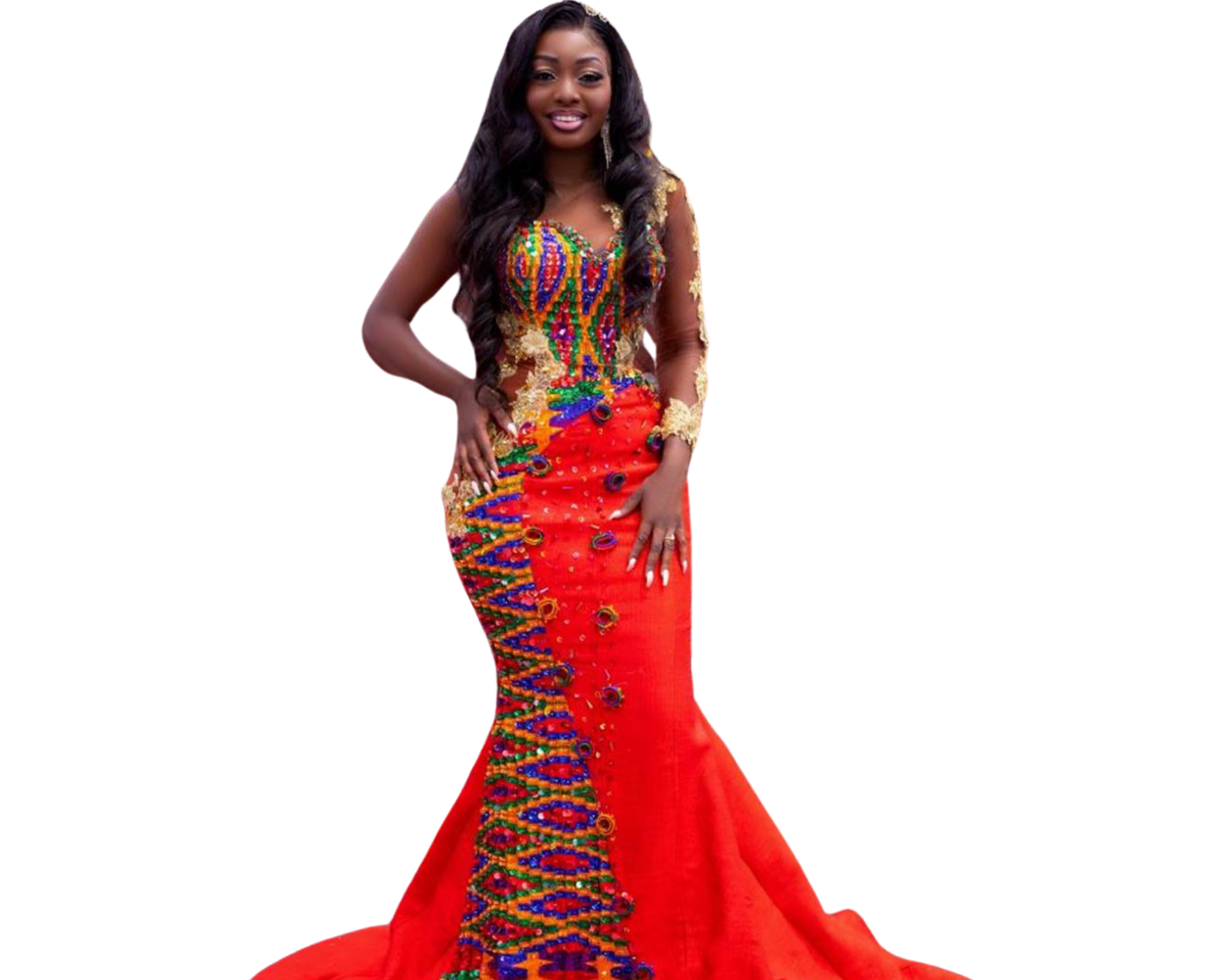Our Dresses are a gorgeous combination Of Authentic, Premium and or Royal Kente Cloth with Creative design and adorned with precious West African stones.