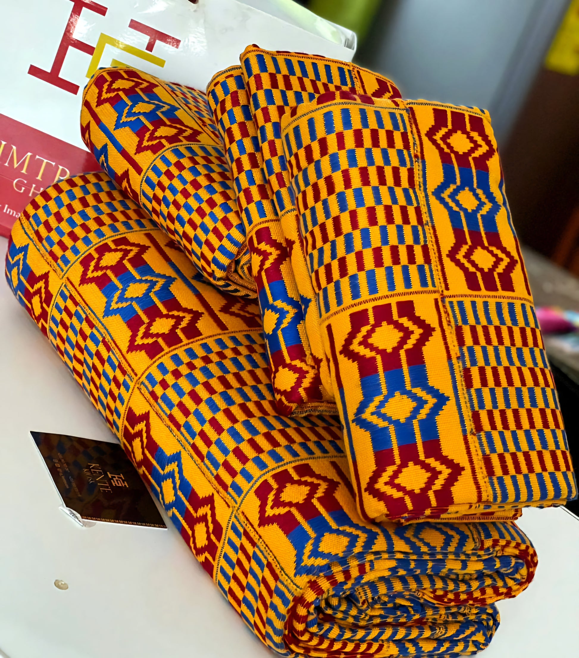 This fabric is the original Kente cloth and we cut no corners as many do to raise their profit by using a cheaper china thread that has flooded the market, where as we offer a guarantee for the real fabric and unlike many others, you get the design you see in the image and not something one may think is similar as we boost having the top weavers and designers in Ghana.