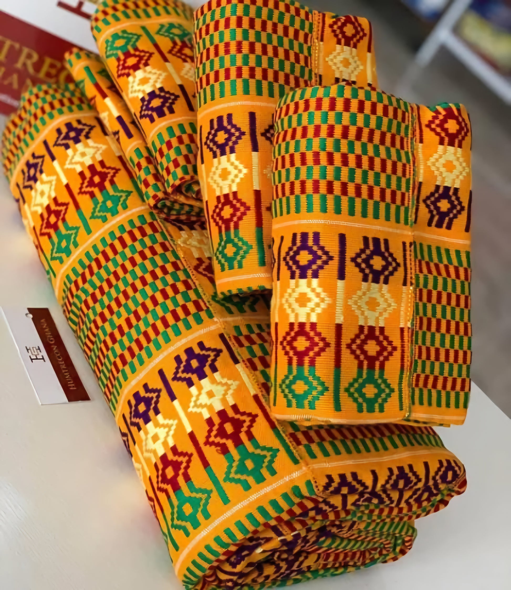 This fabric is the original Kente cloth and we cut no corners as many do to raise their profit by using a cheaper china thread that has flooded the market, where as we offer a guarantee for the real fabric and unlike many others, you get the design you see in the image and not something one may think is similar as we boost having the top weavers and designers in Ghana.
