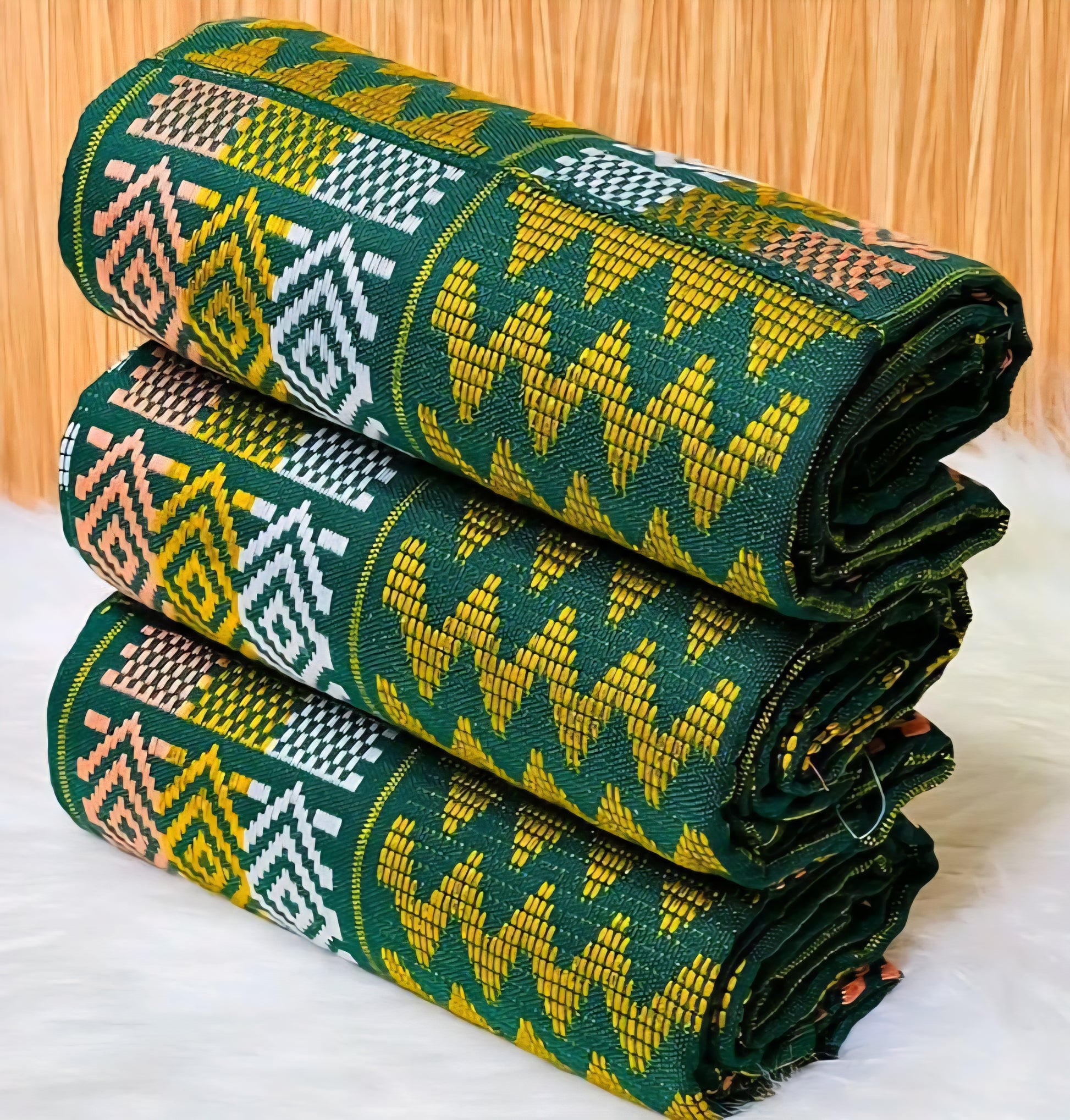 This fabric is the original Kente cloth and we cut no corners as many do to raise their profit by using a cheaper china thread that has flooded the market, where as we offer a guarantee for the real fabric and unlike many others, you get the design you see in the image and not something one may think is similar as we boost having the top weavers and designers in Ghana.