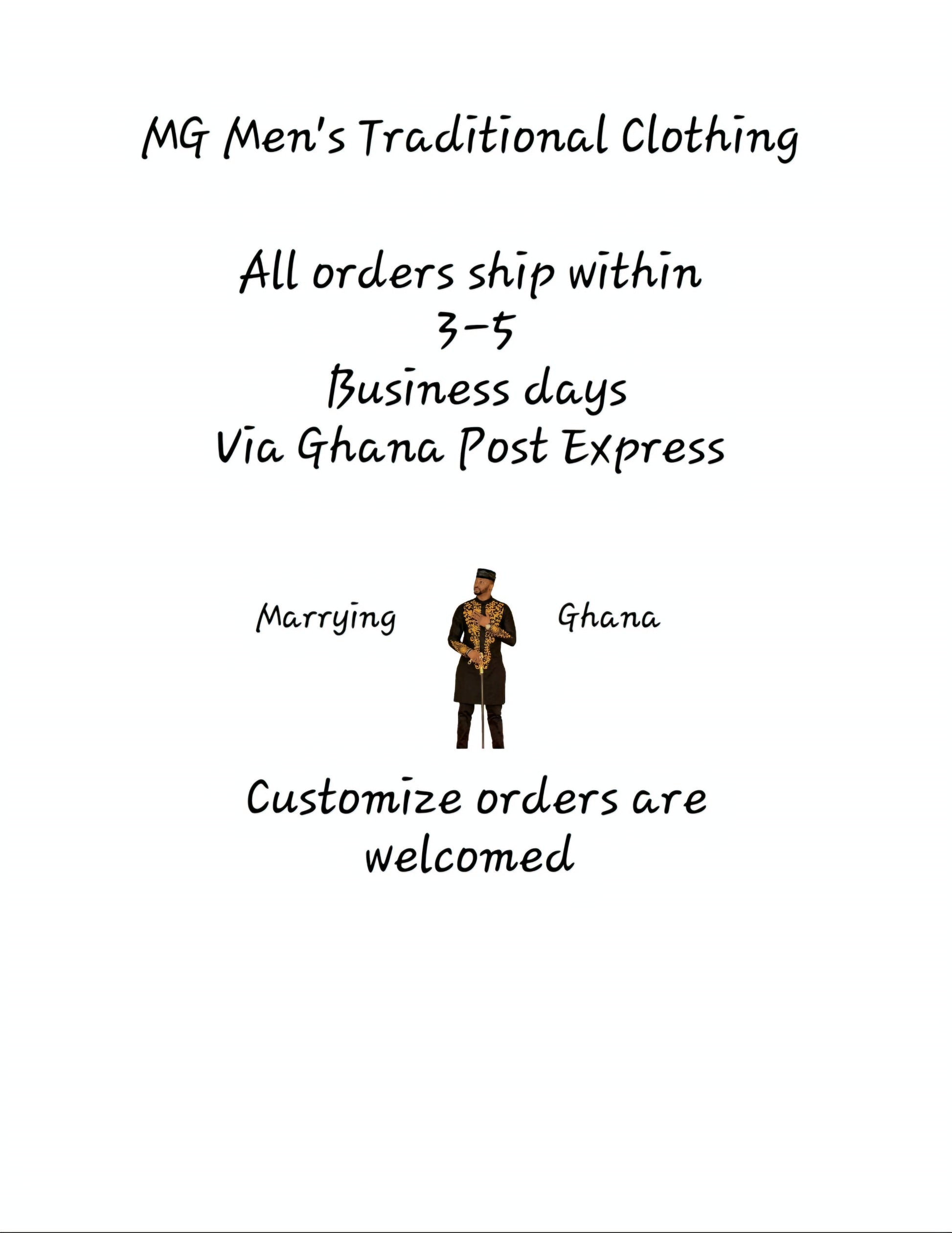 MG Clothing are branded and embroidered with the MGC(Marrying Ghana Clothing) initials for proof of Authenticity from our fashion line.
