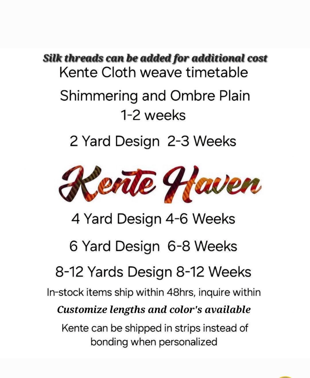Here at MG Kente you'll always get the real thing. Each purchase receives a MG Kente Official shopping bag, MGKH embroidered in a secluded area, certificate of Authenticity with description and model number for each purchase of our Kente heaven line from our headquarters in Wilmington, Delaware in the United States.